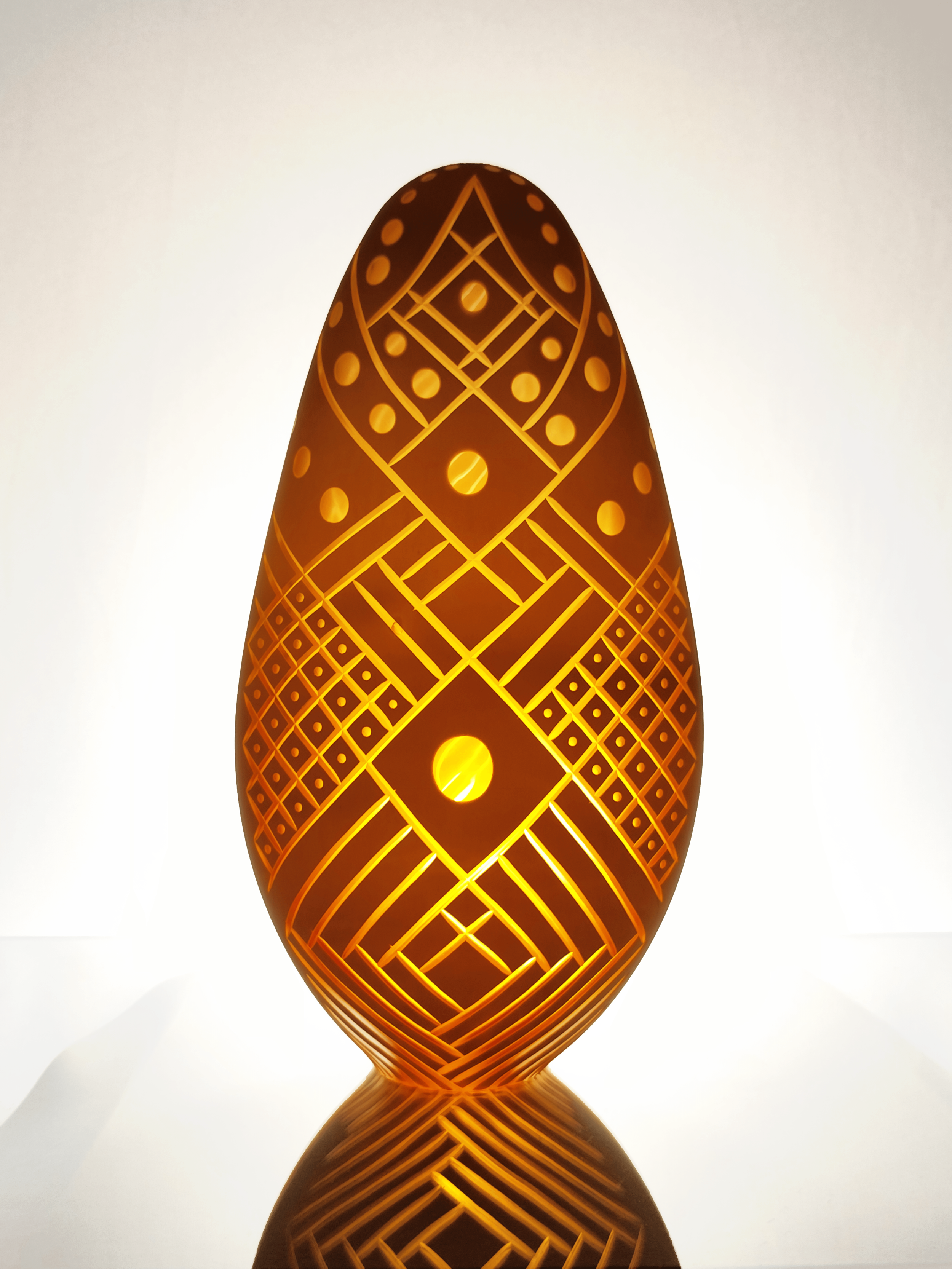 Verre soufflé travaillé et gravé à froid, bois exotique, 38x18x18cm